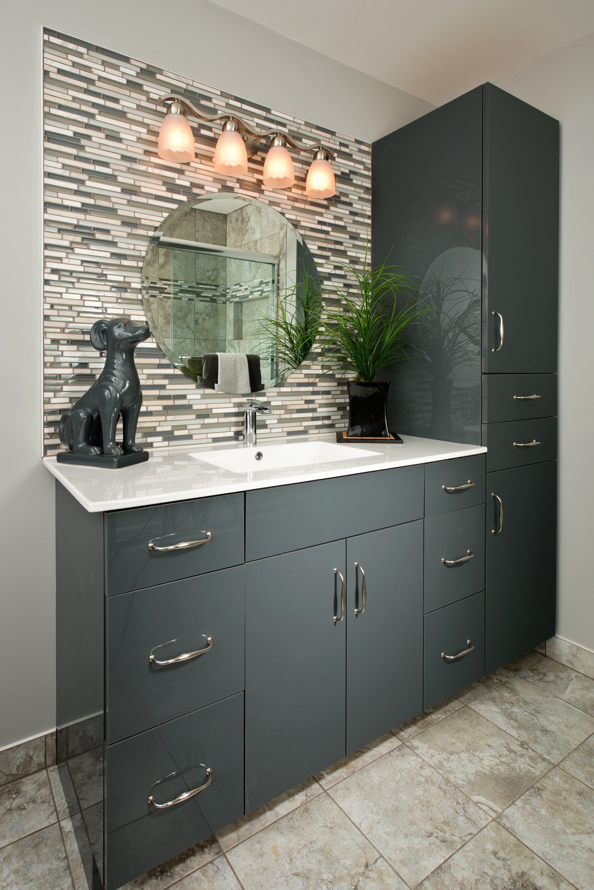 Contemporary Chic seamlessly combines the sleek, simple forms of modern trends with warm and playful textures that give the space its own character and charm. Charcoal colored acrylic cabinets bring a unique twist to a classic layout, playing well with the glass and stone linear backsplash to illuminate the space with reflected light. A white porcelain top softly contrasts with the dark grey tones, bringing contemporary flair with a rectangle bowl. Colors of the tile are pulled into the floor’s own natural contours that balance and ground this style. The gentle curves of the brushed nickel light and hardware break up the stillness of the vanity. Altogether, the distinctive lines with a subtle palette truly make the best use of the space you have.