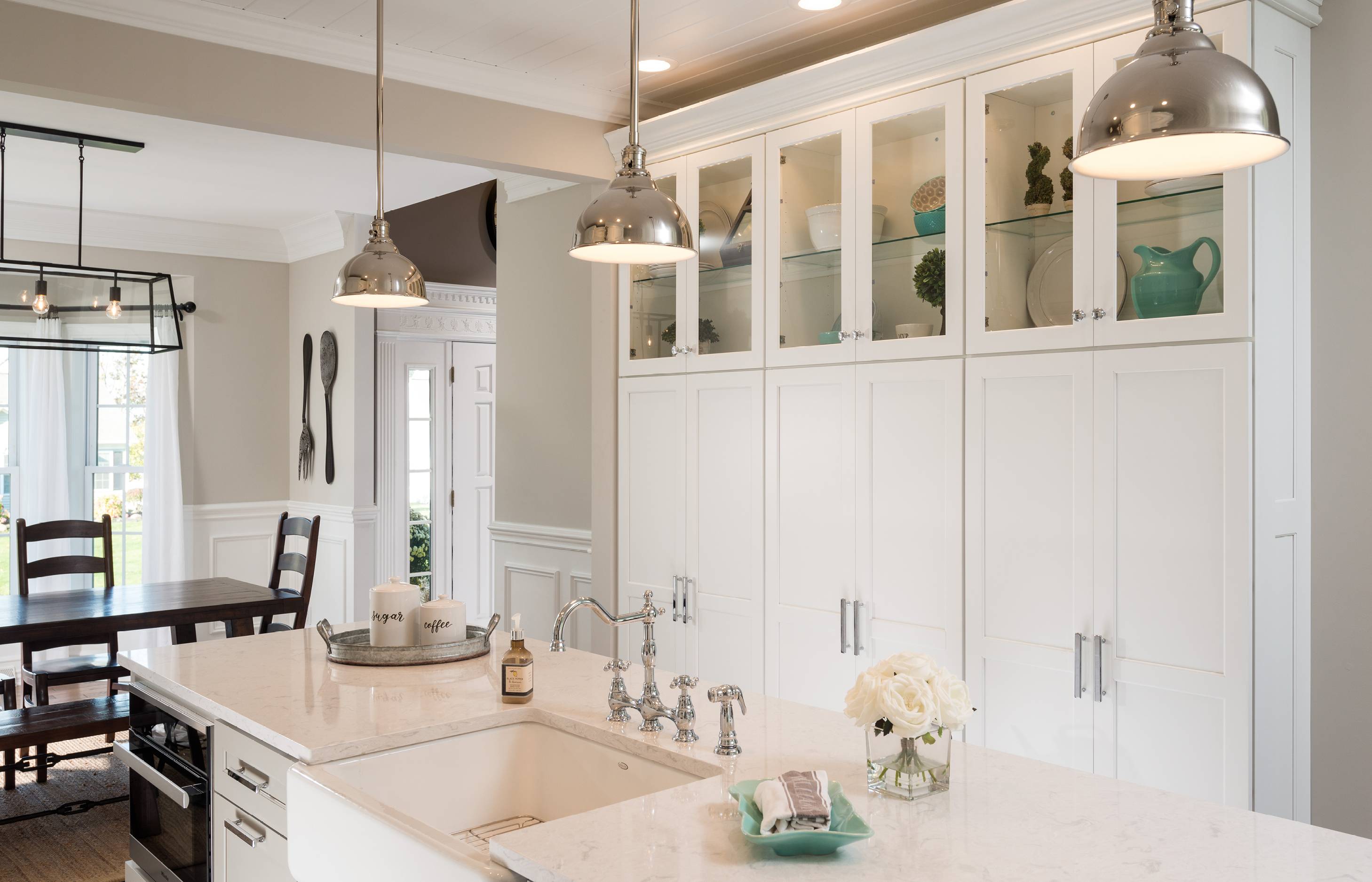 Modern Farmhouse seamlessly combines the warmth of rustic textures and traditional finishes with clean, sleek lines that are the embodiment of modern design. The hand-scraped wood flooring and planked ceiling add texture and interest that beautifully contrast against the clean Shaker cabinetry in modern white and grey tones. The professional style stainless steel appliances are softened with the delicate details of the crown molding, apron-front sink and polished chrome bridge faucet.This is a look that not only satisfies the professional cook, but most importantly is a warm, comfortable gathering space for the entire family.
